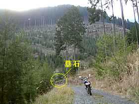 | 起点から約4.1キロ地点まで進むと大城平橋(写真左)を通過します。ここまで来ると残りも僅かで、約4.2キロ地点(写真中央)の樹林帯の道を抜けていくと、約4.4キロ地点(写真右)で伐採された山の斜面を見ながら左へと大きく曲がっていきます。鉈取線のカーブはこの約4.4キロ地点の左カーブが最後となりますが、そこには鴨狩家の墓石が建っています。 | ||||||||||||||