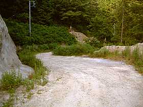 | しかしこの舗装化された勾配の大きな道も長くは続きません。起点から約2.7キロ地点(写真左)まで進むと未舗装路となり、上り坂もその約100mほど先(写真中央)で頂点へと達します。この頂点に達した10mほど先では右手に昇仙峡の奇岩(写真右)を間近に見られます。場所と形状からしてこれは「猿岩」と思われます。猿岩は昇仙峡の渓谷沿いでは最も南側(入り口側)に位置する岩で、長潭橋から馬車道へと入った約600m地点の千田橋近くからも仰ぎ見ることができます。 | ||||||||||||||