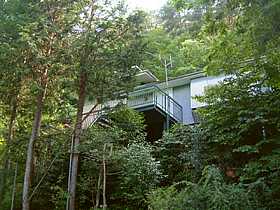 | 猿焼橋から約200m(起点からだと約400m)ほど進むとコンクリート路(写真左)が左へと分岐しています。この左へと入った道については後述しますが、最終的には民家と思われる敷地で終わります。更にその約10m先では再びY字の分岐路(写真中央)となり、こちらも左へと上って行くと約50mで廃屋状態の山荘(写真右)で行き止まります。 | ||||||||||||||