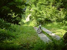 | 林道の起点から約400m地点(写真左)からは少しずつ下草の生えた道となり、小さな段差も見受けられるようになっていきます。約500m地点(写真右)では短い樹林帯の道となり下草もより目立つようになっていきます。右下には約10mの高低差で幅の狭い川が流れておりバイクを停めると水音が聞こえます。 | ||||||||||||||