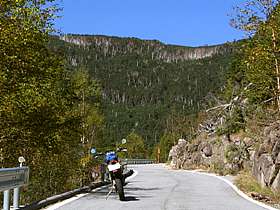 | 九十九折れの坂は焼山峠から約16.3キロ地点(写真左)まで進むと最後の坂を折り返します。ここまで上ってくると標高も既に2250mを超えており、森林限界が近いせいでしょうか、周囲の木々には枝葉のないものが目立ちます。 |