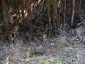 | 林道の看板から約800m地点(写真左)まで進んでいくと樹林層が切れて谷側の視界が一気に開けます。ただ対面の山が近いため景色的には単調です。足下の神田木沢までの高低差は約40mから50m。最初から一貫して寄り添う沢ですが、この辺りの切れ込みが最も深いかもしれません。約1キロ地点(写真右)まで進むと後方に阿夫利山729mと思われる山が僅かに顔を覗かせています。阿夫利山の向こう側は安寺沢地区となっており、同一帯では有名な安寺沢線が阿夫利山に沿って厳道峠へと上っています。 | ||||||||||||||