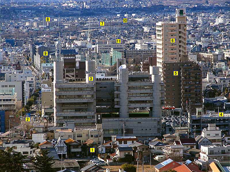| [写真B]甲府駅北側−写真Aの直ぐ右側(北側)で西の方向を望んでいます (1)北口3丁目周辺。(2)甲府駅北口交差点。ここを右(北側)に曲がると約2キロで武田神社(3)山梨日々新聞社、山梨放送社屋(4)パチンコ三井の立体駐車場(5)ラブリイハイツ(6)セインツ甲府(マンション)(7)荒川の音羽橋。手前が音羽町で奥が荒川町(8)市営荒川団地(9)甲府工業高校(塩部町)(10)荒川町周辺(11)朝日3丁目の山梨病院 |