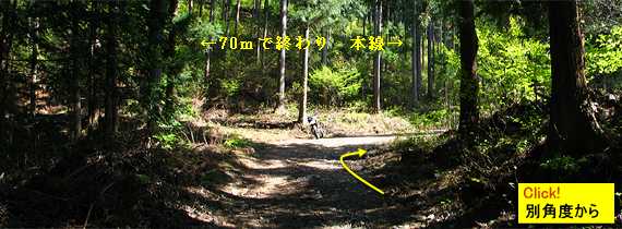 | 入り口から約200mほど進むと樹林帯の道(写真左)となり、このころから景色らしい景色は殆どなくなります。約500m地点(写真右)では左手下方に何軒かの家屋が樹木を通してチラチラと見え隠れしています。実はこの東側には県道24号から同集落へと上っている道があり、この先の菅野線と繋がっています(後述)。 | ||||||||||||||