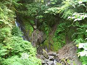 | 前述したように赤岩橋を渡った大城川は左手から右手へと移ります。赤岩橋を約50mも進んでいくと巨大な砂防ダム(2段上の写真右)が右側にあり、その上流は大城川の広大な河原となっています。4輪では段差があるため難しいと思いますが、2輪なら河原へと下りていくことができます。降雨時などでは注意が必要ですが、キャンプなどの際には使えるかもしれません。 |