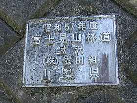 | 起点から約1.0キロ地点まで進むと直路沢橋(すぐじさわはし/写真左)を渡っていき、約1.2キロ地点では高さ1mほどの岩に掛けられた開設標(写真中央)が道の左側に現れます。最初の開設標は昭和57年度でしたが、こちらは昭和60年度。僅か700mの距離に3年もかかったようです。ここまで概ね南へと向かっていた道ですが、開設標の直ぐ先(写真右)からは北西へと向い、名称不明の山449mを反時計回りに廻り込んでいきます。 |