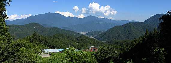 | 起点から約12.7キロ地点(写真左)まで進むと福原地区となって「上の平橋」を渡っていきます。橋上の左手(南東側)には福原地区の家屋を通して、下部町波高島地区の国道52号周辺や、雨ヶ岳1771.7m、毛無山1945.5m、長者ヶ岳1335.8mなどといった県境の山並み(写真右)を見通します。 |