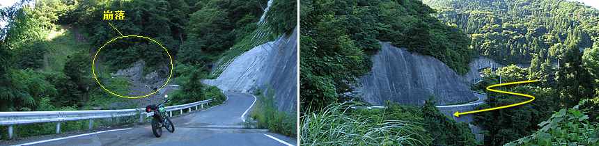 | 早川町側へ入ったといっても路面等に大きな変化はありません。ただ、当日は約14.5キロ地点(写真左)で小さな崩落が起きていたので注意して進みましょう。なお何度かのアップダウンはあるものの、早川町側へ入ると上り基調の道(写真右)が続きます。 |