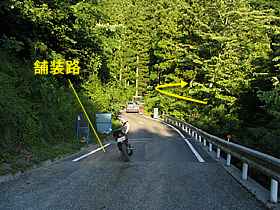 | 起点から約20.8キロ地点(写真左)まで進んで林道のピークへと到着です。早川町には笹走地区から早川地区へと抜ける道筋に「五箇村峠」があるようなので或いはここがそうかもしれません。標高的には1000m前後といったところでしょうか。約17.3キロ地点の分岐点が約700m前後だったので、約3.5キロで約300mほど上ってきた計算です。ピークからは右へと曲がっていき、曲がり切ると直ぐに舗装が切れて未舗装路(写真右)へと変わります。 |