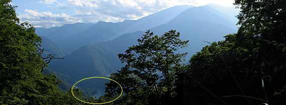 起点から約25.9キロ地点(写真左)まで進むと、左手の谷間を通して小さく早川地区の集落(写真右)を望みます。同地点からは県道37号へ抜けていく際の「早栄橋」や、その出口に建つ「蕎麦屋アルプス」などがまさに一望です。ただ見えるのはほんの一瞬。注意していかないと見逃します。さてここからは終点へと進み県道37号へ抜けていきますが、容量が大きくなったのでページ5へと移ります。