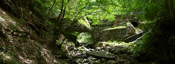 | 林道の杭から約200m地点(写真左)まで進むと左手に分岐路が現れます。道そのものは直ぐに途切れてしまいますが、その奥には鬱蒼とした木立の中に苔むした水道橋?(写真右)がひっそりと架かっています。 | ||||||||||||||