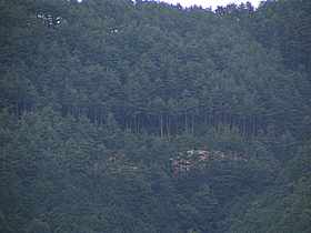 | 周囲に建つ家屋は7戸から8戸といったところでしょうか。家屋の間を抜けていくと、林道の杭から約1.6キロ地点(写真右)で最も東端に建つ家屋の前で右へと大きく曲がっていきます。なお同地点は大鳥居林道や桜峠林道からも見ることができ、両林道側から見ると山の斜面に張り付くようにして建つ集落がいかに山深い場所にあるかが分かります。 |