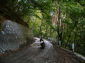 | 国道411号から約7.1キロ地点(写真左)まで進むと上げ下ろし式の簡易的なゲートが現れます。ゲートの左側には1m以上の隙間があり2輪なら簡単に擦り抜けてしまえますが、このゲートがいつ閉鎖されるのかは知りません。約7.4キロ地点(写真右)まで進むとコンクリートで舗装化された道へと変わります。 |
