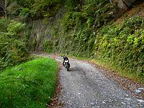 | このコンクリート路へと変わった地点で左手に視線を移すと、後川を挟んだ対面の山腹にプレハブのような小屋(写真左)が建っています。が、近くには渡っていく橋もありません。いったいこの小屋にはどうやって行くのでしょう(不明)。更にその小屋の先には熊倉山1624mから下ってきた川が滝となって落ちこんでおり、バイクを走らせていても水音が激しく聞こえます。コンクリート路は約100mほどの区間だけで、約7.5キロ地点では再び未舗装路へと変わります。 |