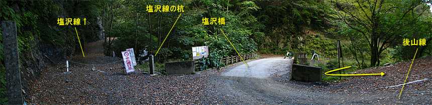 | 国道411号から約4.8キロ地点(写真上)まで進むと「塩沢橋」が架かっており渡っていきます。塩沢橋の右手(北側)からは塩沢を流れ下ってきた川が橋下部で後山川と合流しており、橋を渡りきると直ぐに林道塩沢線の未舗装路が右手へと分岐しています。ただし当日は工事中ということでチェーンがかけられており通行止め。地図上では塩沢に沿って続く700mほどの短いピストン林道のようですが入ったことがないので詳しくは知りません。 |