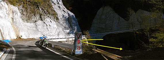 | ここからはページ2からの続きです。林道の看板から約13.7キロ地点(写真左)からは既に路肩もコンクリート化されています。路面も綺麗にローラーがかけられおり2006年度の冬季閉鎖解除後には舗装化されているかもしれません。約14.2キロ地点(写真右)まで進むと鋭角的に左へと折れていき、ここからは暫くは、いま下ってきた道を上に見ながら南へ、そして東へと進んでいきます。 |