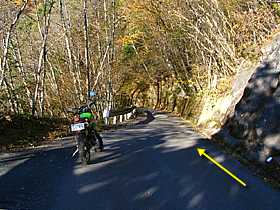 | ここからはページ3の続きです。林道の看板から約19.4キロ地点(写真左)で増穂町と早川町の町界に架かる北湯川橋まで進むと、橋を境に一転して上り坂(写真右)へと転じます。下り坂となったのが林道の看板から約11.1キロ地点。約8.3キロという長い距離を軽快に下ってきただけに自転車などの方ではより厳しく感じるかもしれません。 |
