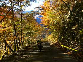 | が、この約21.2キロ地点から始まる未舗装路も約100mほどと短い区間でアッという間に終わってしまいます。林道の看板から約21.3キロ地点(写真上)まで進むと骨沢橋となり、未舗装路はここから舗装路へと変わります。 |