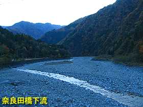 | ちなみに右折した県道37号側を書いておきますと、丸山線終点から約300mほど進むと早川に架かる「奈良田橋(写真左)」が現れ対岸へと渡ります。一級河川の早川も同地点付近ではダムが近いこともあり数m幅の川(写真右)が流れているのみで、山々に狭窄された広い河原(写真右)に細い水の流れが長く続きます。 |