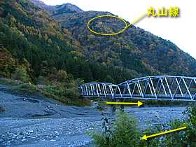 | ここからはページ4の続きです。さて林道の看板から約27.3キロ地点(写真上左)まで進むと大きな鉄塔の右側を抜けていきます。非常に大きな鉄塔で、道も直ぐ脇を抜けていくので直ぐに分かると思いますが、ここまで来たら左側を見てみましょう。左やや前方に大きな橋(写真上右)が見えると思います。この橋は早川に架かる県道37号の「奈良田橋」で丸山線はこの橋の直ぐ手前で終点を迎えます。またその先には先ほど見えた奈良田第一発電所(写真下)も見えると思います。奈良田第一発電所の建つ地点には開運トンネルがあり、現在の県道37号(南アルプス街道)はここでゲート規制となっています(後述)。 |