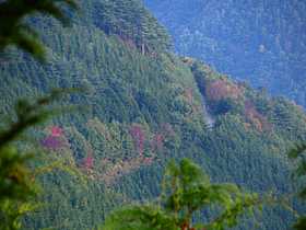 | 同地点からは南東側からは北東側の眺望(写真左)が広がっており、市川大門町方向から山梨市方向にかけての眺望を得られます。また足下の山腹には、ここまで上ってきた道筋(写真右)が長く続いています。 |