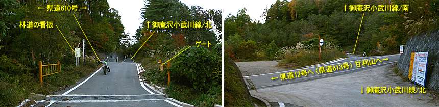 | 林道の杭から約14.0キロ地点(写真右)でゲートが現れると、その約20mほど先で県道613号の甘利山公園線へと突き当たります。同地点は十字路となっており、県道613号を左へと上っていくと約6.0キロで甘利山駐車場へと続き(その先には小字沢線が接続していて小武川線へと抜けられます)、逆に県道613号を右へ下っていくと約7.5キロで県道12号へと至ります。また今回は県道613号の南側だけしか掲載していませんが、県道613号を突っ切って真っ直ぐ進むと更に御庵沢小武川線が続いており、最終的には小武川線へと続きます。 |