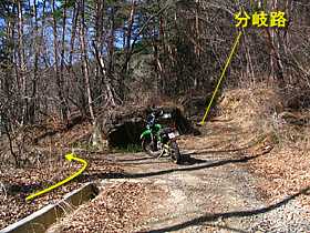 | なお同地点へ出る場所は逆Y字路(写真左)となっており、ほったらかし温泉側から入る場合は二又に分岐している左側の道へと入っていきましょう。同分岐路の入り口には手書きの「←棚山、フルーツ公園→」と書かれた案内板(写真右)があるのでこれを目印にしても良いでしょう。ちなみに右の道は中で幾つかに分岐していますが全て行き止まり。最後は幅1mほどの小川で道が途切れます。 |