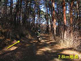 | 道幅は概ね1.5車線弱ほどありますが、中央が流水によって深く掘り下げられており実際の走り幅としてはそれほど広くありません。また写真では分かりづらいと思いますが、路面は湿り気のある土質に加え落ち葉で非常に滑りやすくなっています。下手な場所で停まると再発進に苦労するので一気に上ってしまいましょう。 |