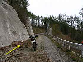 T字路を左折すると「みずがき湖」の西側を廻り込んで信州峠へと向かっていく。暫くは見通しの利く中央分離帯付きの2車線路だが、やがて勾配が大きくなるにつれ中央分離帯はなくなる。やがて何処にでもある山道となり、みずがき湖のT字路から約8.5キロ地点(写真左)まで進むと横尾山線が左へと分岐している。横尾山線の長さは17540m。完抜したのは昨年のことである。ここから入った横尾山線は最終的には高根町の高須線へと至るが、瑞垣山や八ヶ岳などを望みながら走る約17キロという未舗装林道は県内でも屈指だ。そして「みずがき湖」のT字路から北進すること約9.8キロ。道のりとしてはやや長いが、今回の目的地である松平線(写真右)へと到着。