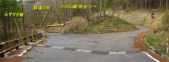 | ここからは小川山線の最終地点へと向かってみる。松平線の終点を左折して小川山線へ進むと、約1.1キロで「みずがき線」が右手へと分岐(写真左)している。松平線の終点からここまでは全線舗装。数年前までは未舗装路だったのだが、昨年まで続いた工事で舗装化されてしまったようだ。ただ「みずがき線」との接続地点以北は約100m先から以然として未舗装路(写真右)となっている。 |