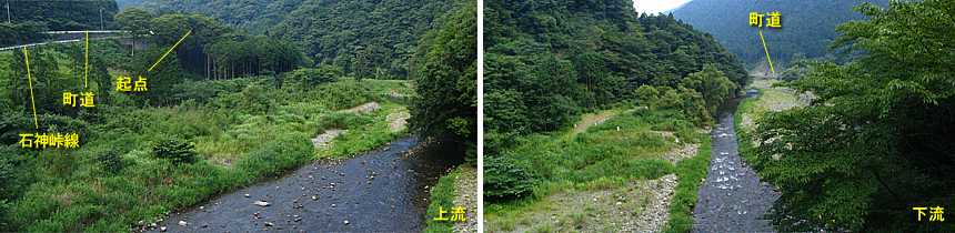 | バス道から行った場合、石神峠線は町道佐野線から折り返すようにして南へと下って(写真左)いきます。入り口はコンクリートで舗装されていますが、約30mも進むと未舗装路(写真右)へと変わります。左手には10mほどの高低差で佐野川が奥へと流れ下っており、その先には天子湖大橋が見え始めます。 | ||||||||||||||