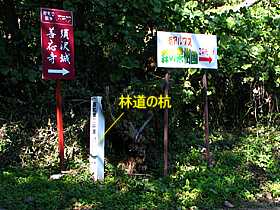 | 塩前第二林道は中巨摩郡白根町須沢(現在は南アルプス市須沢)地区の御庵沢小武川線と旧白根町塩前地区の塩沢線を結んでいる林道です。甲府市方面からの行き方を簡単に書いておくと、まずは県道20号を西進して信玄橋側から旧白根町まで進みます。旧白根町まで行くと「塩沢入口」交差点があるので更に約1.0キロほど西進します。道の左側に「塩の前入口」バス停の立つ分岐路が右へと延びており、同分岐路を右折していくと直ぐに御勅使川(みだいがわ)に架かる白根西橋となるので渡ったら直ぐに左折します。約100mほど進むと正面に消防団詰所の建つ逆Y字路が現れるので左折。あとは道なりに進むと逆Y字路から約1.3キロで御庵沢小武川線の林道杭が立っており、その約900mほど先で塩前第二林道(写真左)が右へと分岐しています。同地点には塩前第二林道の杭(写真右)や「善応寺、須沢城→」という案内板があるのでこれを指標にすると直ぐに分かると思います。補足)ここまでの詳しい道のりは御庵沢小武川線のページを参照してください。 |