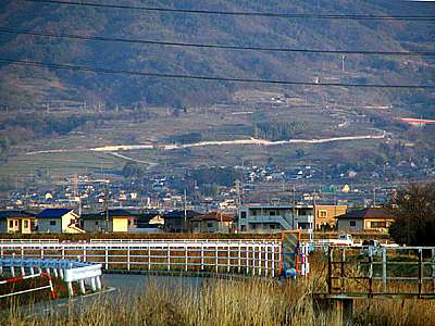 | 16時43分 万才橋を過ぎた甲府市上今井町付近。 上今井町は小瀬スポーツ公園の西側にある町だ。 まだ1.5キロくらいはあるものの、荒川の土手へ登れば野球場の照明や時計台も見えている。 |