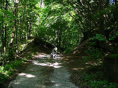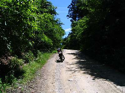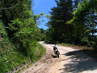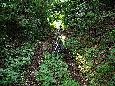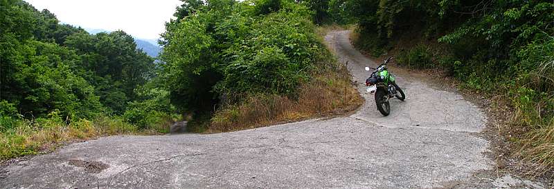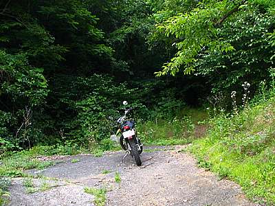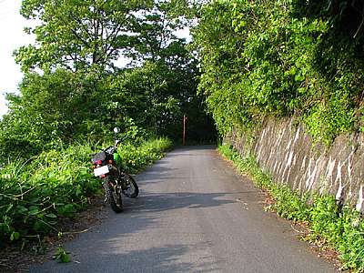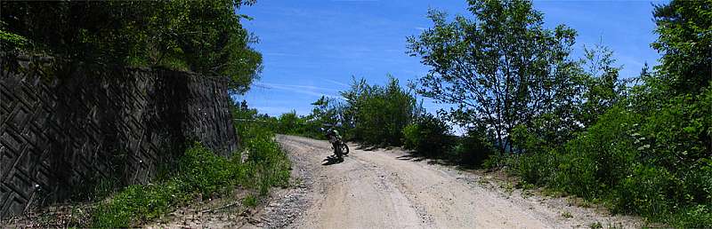 おっと、これは狭い道だ。 幅は1m50センチから2mくらいだろうか。 両側が落下していて細い尾根道といった感じだ。 走る分には問題のない広さだが、この先が行き止まりだったらUターンが出来そうにない。 ということで、ここからは歩いて行ってみることにした。 |