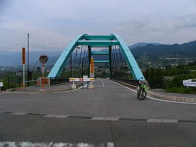 | そうこうしている内にも富士川大橋まで出てしまった。 富士川大橋は富士川に架かる橋で、渡ると増穂町の国道52号へと抜けていく。 |