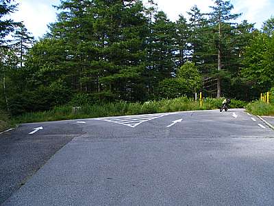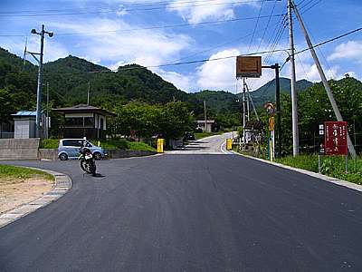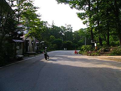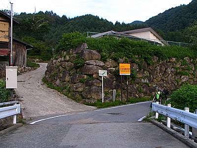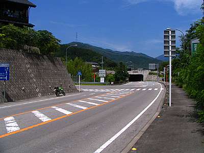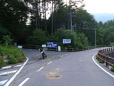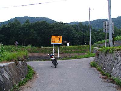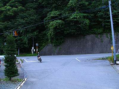 | 午後6時12分 あとは道なりに進むと一般道のT字路へと突き当たる。 右へ曲がると500mほどで長野県となるが、残念ながら県境を示す看板はない。 |