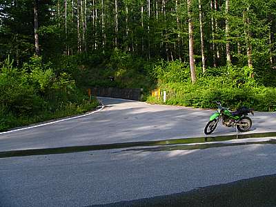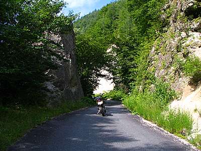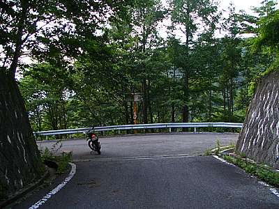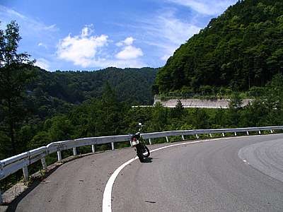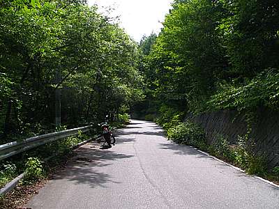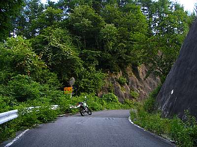午後5時13分 前方の道は県道610号。 杣口林道の起点からここまで47.8キロ。 牧丘町からずっと林道で繋がってきたクリスタルラインも、ここからはいったん林道を離れ県道を走ることになる。 同地点を左折して県道610号を南進。 岩屋堂地区を目指し、そこから高須林道へ向かうことにする。 |
