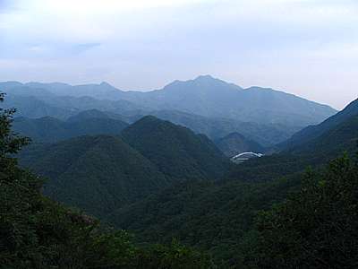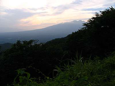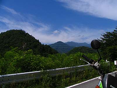 午後5時45分 だいぶ標高が上がってきた。 南東の遠くに見える山は金ヶ岳や曲岳。その遙か手前に見える橋は県道610号の「みずがき湖」を渡る鹿鳴峡大橋だ。 |