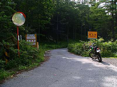 | 午後6時00分 横尾山林道との分岐点。 右へ曲がると横尾山林道となり再び信州峠近くの県道610号へと戻っていく。今回は左折するが、横尾山林道では素晴らしい山並みが広がる場所もあるので、行ったことのない人は行ってみても面白いだろう。 |