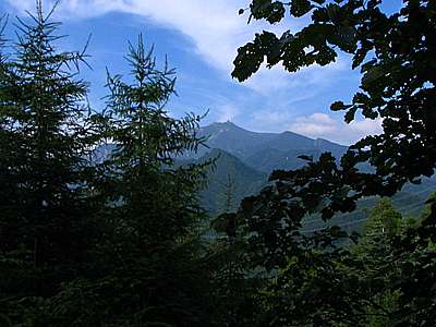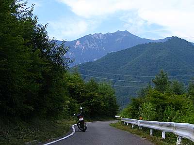 | 午後4時56分 みずがき林道の分岐点。 みずがき林道は全線舗装の広い林道だ。 有料道路並みの綺麗な道で、ラスト近辺では息を呑むほど巨大な瑞垣山を仰ぎ見る。 林道としては綺麗な道すぎて面白くはないが、正面に見る瑞垣山は圧巻だ。行ったことのない人は1度は行ってみてもいいだろう。 |
