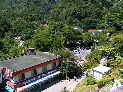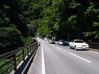 | 午後1時02分 うひょ〜、凄い人出。 板敷渓谷の入り口となる板敷橋には延々と車が停まっていた。 ちなみに板敷渓谷は非常に薄暗いV字の渓谷だ。最奥部までは徒歩で約10分。最後は段瀑30mの大滝が待っている。