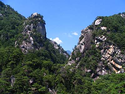 | 午後12時49分 県道7号を更に北進して覚円トンネル手前から仰ぐ覚円峰(左)と天狗岩(右)。渓谷や仙娥滝(せんがたき)とあわせ昇仙峡のシンボル的な存在だ。 |