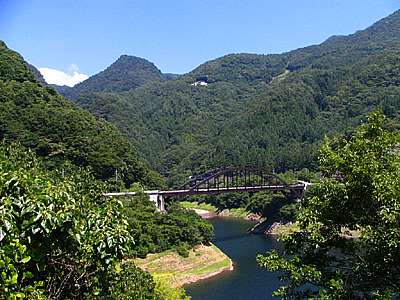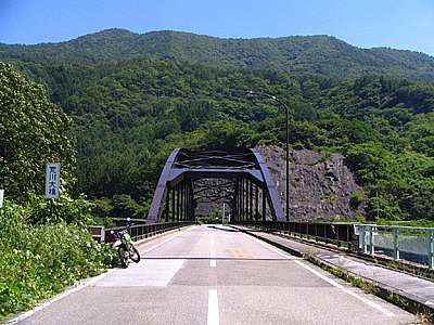 | 午後1時00分 能泉湖に架かる荒川大橋。 橋を渡りきるとT字路になっており、野猿谷線へは左へと曲がっていく。なお右へ曲がると先に見えていた高成線へ上っていく。