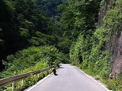 午後1時06分 野猿谷林道は黒平町やクリスタルラインへ最短ルートで抜けられるように開設された林道だ。 林道の名称通り、野猿谷の渓谷地帯を縫っていく。このため午後になると直ぐに陽が陰る。行くなら陽の高い内がいいだろう。 |