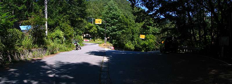 | 午後12時53分 荒川ダムへの分岐点。 黒平町へは御岳林道か野猿谷林道を使うことになる。 どちらにするか迷ったが、より短時間で行ける野猿谷林道を使うことにした。 |