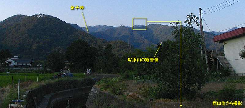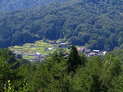 | 午後5時58分 標高が上がり、先ほど通ってきた黒平町の集落を見下ろす。 ちなみに集落の背後が黒富士1635mのようである。山梨百名山にもなっており、いつかは行きたいと思っている。 |