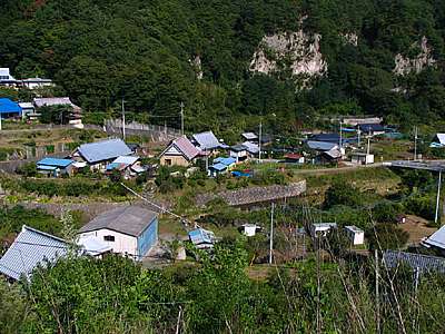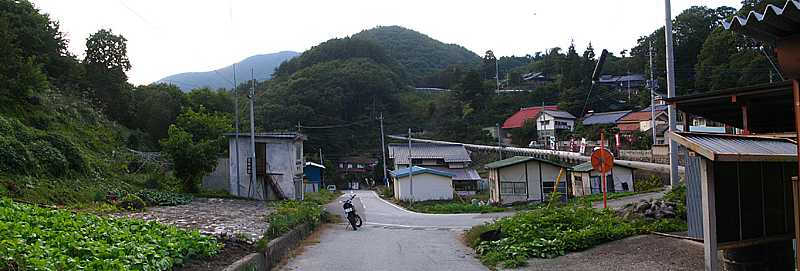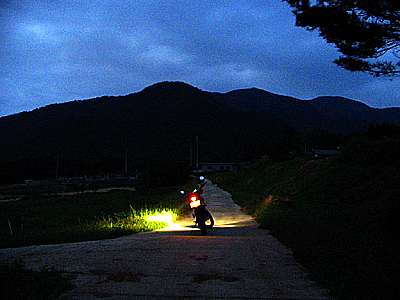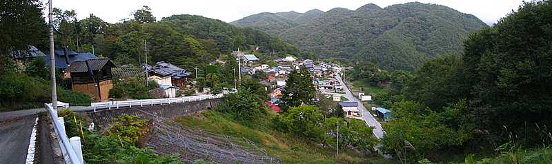午後4時34分 林道の終点を経て小尾神戸地区へと到着。 このころにはすっかり曇ってしまい、日没とともに少し肌寒さを感じるようになってきた。 |