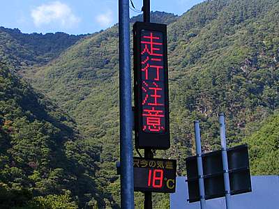 午後1時35分 県道沿いに設置された気温計は18度。 冬着のジャケットを着てきたのだが、まだ寒さに慣れていない身体には少々肌寒く感じた。 |
