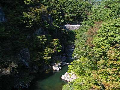 | 午後2時05分 みずがき湖で一息ついたあと、本谷川に架かる増富大橋を渡って湖の裏へと廻ってみた。 写真下の左側に写っている建物がビジターセンターで中央が塩川ダム堰堤。この堰堤の上を県道610号が走っており、右側の鹿鳴峡大橋へと続いていく。 ちなみに県道610号は「みずがき湖」を起点として最終的には信州峠から長野県側へと抜けていく。 |