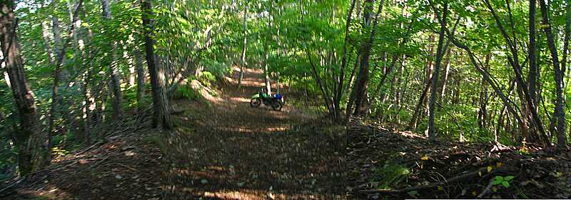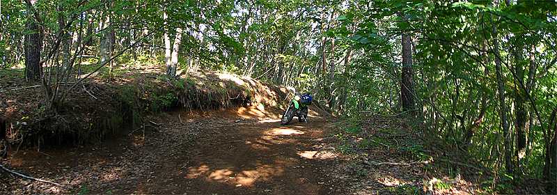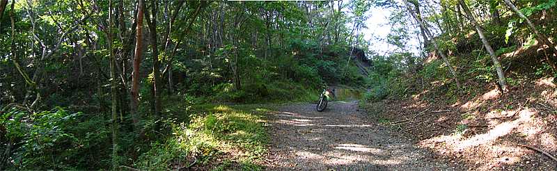 午後2時45分 入り口から約2キロ。 やや勾配の大きな道を上って林道のピークへ到着。 ずっと未舗装路の続く道だが、景色的に冴えないのがちょっと残念だ。 |